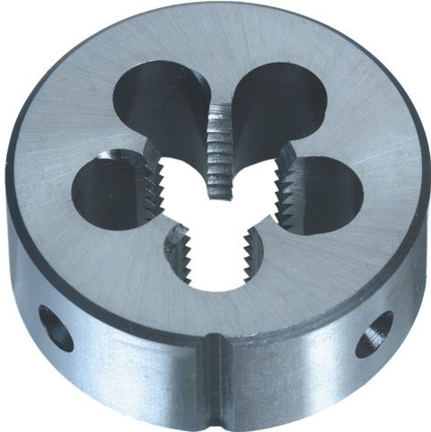 Круглая плашка представляет собой гайку, сопряженную с нарезаемой резьбой, превращенную в режущий инструмент путем прорезания стружечных канавок и затылования зубьев. Она служит для нарезания наружной резьбы. Плашка не может нарезать резьбу высокой точности, так как после термической обработки в ее резьбе невозможно устранить возникшие при этом искажения шага, угла профиля. Однако из-за дешевизны и несложной эксплуатации плашки получили широкое распространение. Число стружечных отверстий у плашек колеблется от 3 до 7 для резьб диаметром от 2 до 52 мм. Большое влияние на работу плашки оказывает ширина зуба. С увеличением ширины зуба увеличивается прочность и жесткость, плашка лучше центрируется и самозатягивается при работе. Однако большая ширина зуба приводит к повышенному трению, ухудшает отвод стружки и ее размещение в канавках, что может вызвать поломку плашки.